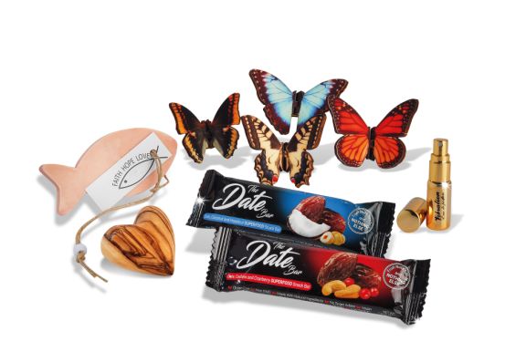In het pakket zitten 6 producten: een heerlijk parfum voor in de handtas, een hartje van olijfhout uit Bethlehem, twee heerlijke dadelrepen, een vrolijk Ichtusvisje zeepje 'faith-hope-love' en een bouwpakket met 4 gezellige vlinders die makkelijk in elkaar te zetten zijn.
