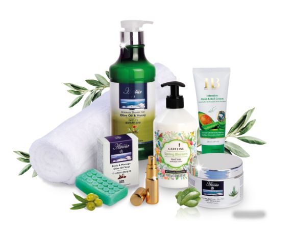 Een milde douchegel en een luxe zeep, beiden verrijkt met olijfolie, een rijke bodybutter en een zachte handcrème, beiden met aloë vera. Een vloeibare handzeep en een fijne katoenen handdoek uit Bethlehem.