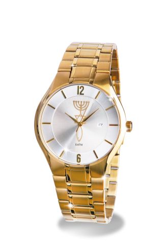 Art nr. 19067Een prachtig goudkleurig herenhorloge van roestvrij staal. Met op de wijzerplaat in goudkleur gegraveerd de Menora-Davidster-Ichtusvis en daarbij een datumnotering.Diameter 38mm Waterdicht 3ATM Wordt geleverd in een geschenkdoos. Lees meer